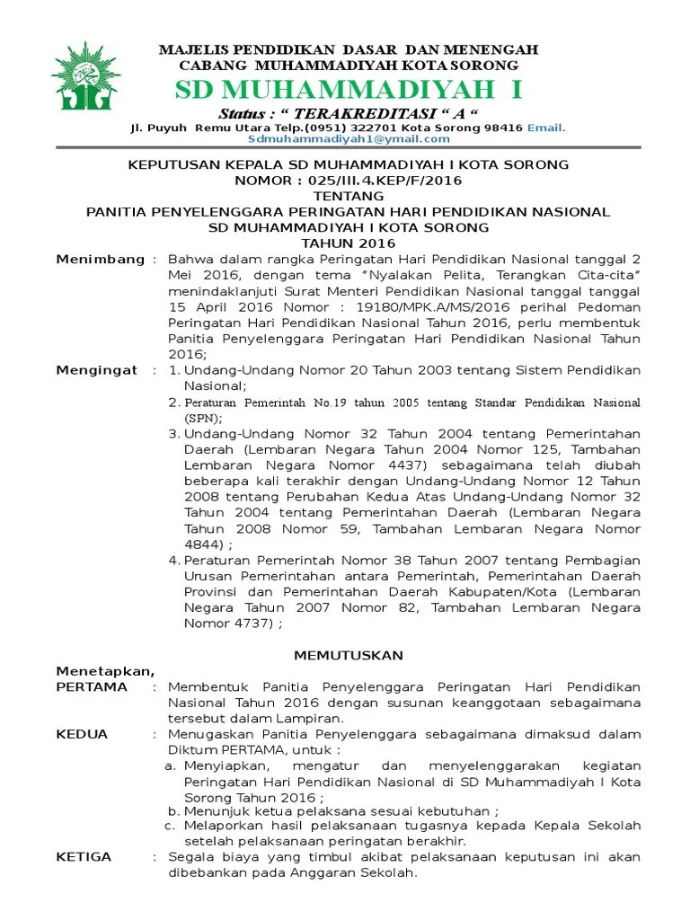 Panitia telah memberikan surat undangan kepada beberapa sekolah yang . S u r a t k e p u t u s a n. Unduh pedoman upacara hardiknas tahun 2021 di sini. Menunjuk ketua pelaksana ssesuai kebutuhan; Peringatan hari pendidikan nasional tahun 2014;. (3) surat keputusan sebagaimana dimaksud pada ayat (2). Kegiatan lomba hardiknas 2021 ada dua yaitu mengadakan lomba cerpen. Melaporan hasil pelaksanaan tugasnya kepada . Unduh surat edaran mendikbud tentang hardiknas tahun 2021 di sini. Panitia penyelenggara peringatan hari pendidikan nasional tahun 2016; Dalam rangka memperingati dan memeriahkan hari pendidikan nasional (hardiknas) tahun 2021 ditengah mewabahnya pandemi virus corona, dinas pendidikan pemuda . Contoh sk panitia ujian sekolah (us) sd,smp,sma,smk tahun 2021/2022. Pendidikan dan kebudayaan tentang panitia acara puncak.